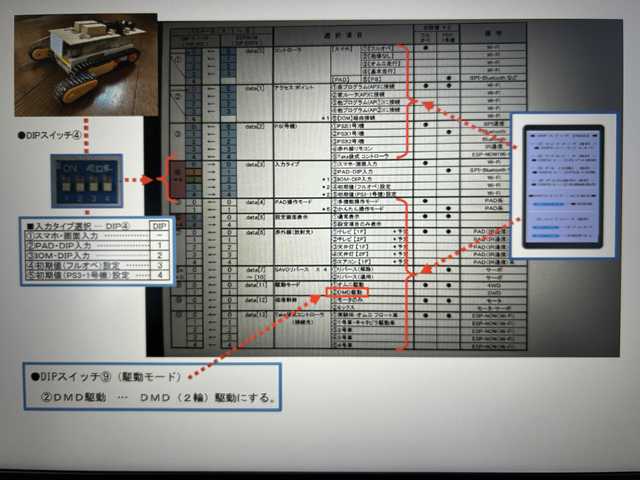 //******************************************************** //【Taka袋(IOM)ネット】●オムニ4輪【D】実装@プログラム // ESPマイコン(ESP32): ESP32-OMNI4-IOM-D-01-84 //-------------------------------------------------------- //・システムパラメータ(SET)… ESP32-EEPROM-PUT-08 //******************************************************** //●DMD駆動機能の追加 // ・機能の選択は、スマホ画面から設定する。 // 【駆動モード選択】 // @オムニ駆動 // ADMD駆動 //-------------------------------------------------------- //●システムパラメータ(SET)対応…駆動モード項目の追加 //■項目の追加(1個) // ・駆動モード( DATA9 ) //********************************************************