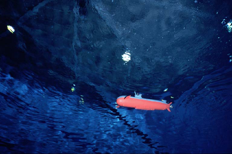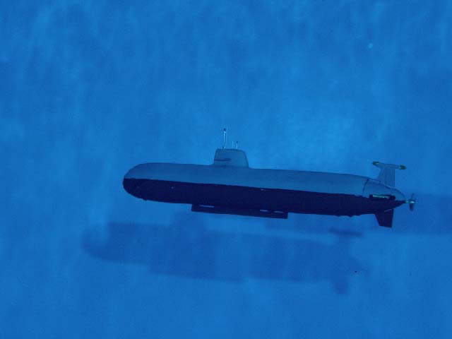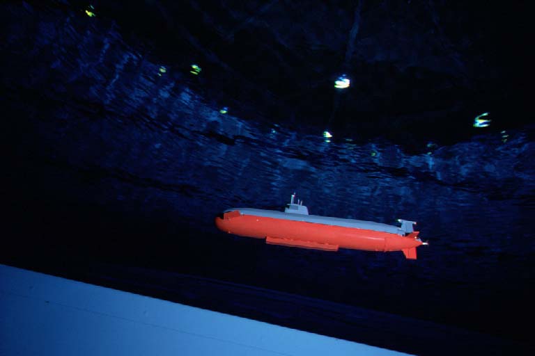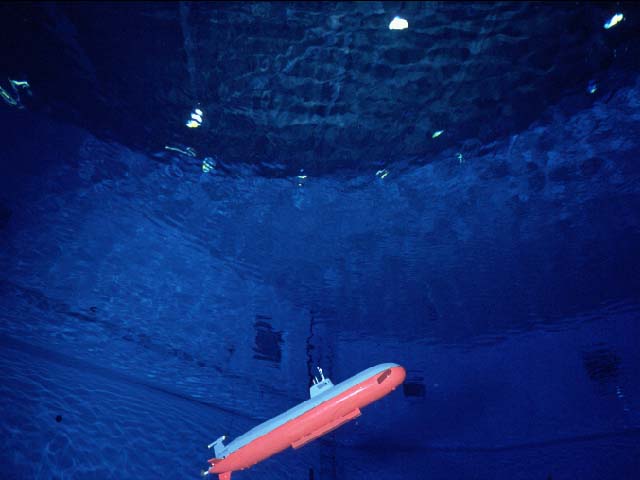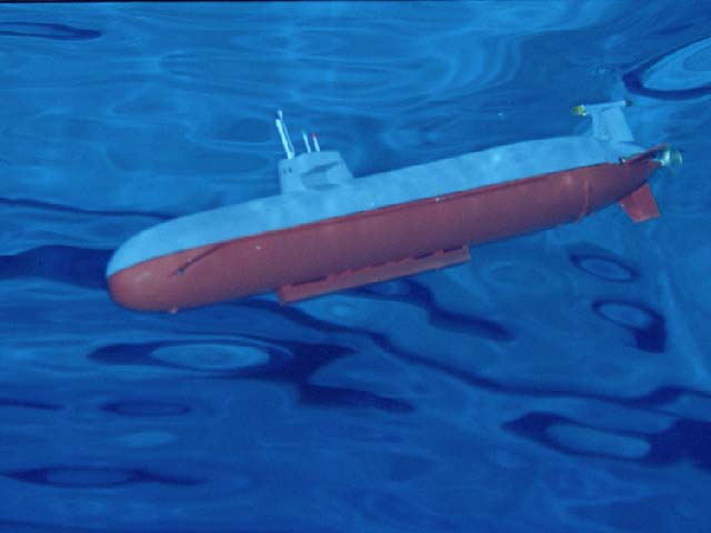 第1回「アクアモデファイター・ミーティング」で、『おやしお−F』試運転走行・・・ ■当日は、3メートル・エリアのみオープンしていましたので、厳しい状況の中、一番手の走行で不安でありまし たが、それなりの走行ができましたので、まずは、テストOKです。 → テストモードから、数分後には、お遊びモードに変わっちゃいました。 エヘヘ・・・ ◆『おやしお−F』を、3メートル・エリアで、着底テストを行いました。 @バラストタンク(空)状態 ・『おやしお−F』は、水上での停止状態で、バラストタンクは、空っぽである。 Aバラストタンク(注入)状態 ・水上での停止状態から、バラストタンクへ注入開始後、数秒経過してから、 → 『おやしお−F』が、ゆっくり沈んで行き、深度3メートル先に着底できた。 船体の姿勢も、ほぼ水平状態を保っていた。 ウ〜ン・・・ いい感じでした ナイスですね Bバラストタンク(排出)状態 ・深度3メートルの着底状態から、バラストタンクから排出開始後、数秒経過してから、 → 『おやしお−F』が、ゆっくり浮かんできて、無事に水上まで戻ってきた。 船体の姿勢も、ほぼ水平状態を保っていた。 ウ〜ン・・・ なかなか カッコいいですね ◆着底テストの感想 @着底テストを、3回、トライアルしましたが、同じ動作をしました。 → ポンプの水漏れはありますが、まずは、OKですね A着底テストは、家のお風呂でのテストと同様に、深度3メートルも、同様な結果がでました。 但し、家のお風呂では、着低してから、しばらくすると、自動的に浮上してくる現象が確認できました が、深度3メートルで約10秒ほど、着底した状態で確認したのですが同様な現象がでませんでした。 → 深度3メートルでの水圧の影響なのかな? ほぼ同じ場所で、プラモデル改造のUボートが、深度3メートルで着底した時に、身動きできない状況 になりました。メカボックスへの浸水と思われましたが、水上へ引き揚げて、船体の中身を確認したと ころ、まったく異常はありませんでしたので、やはり深度3メートルでの水圧による、浮力は弱まるの ではと、感じました。 Bバブレスタンクについて バラストタンクとして、バブレスタンク(170cc)を搭載しており、船外との(注入/排出)パイ プは、1本のみで行いました。 → これはバブレスタンクのノーマル仕様ですが・・・ バブレスタンクは、注入前に、バルーンの空気を抜く必要性があるみたいですが、今回は、なにもせず にやりました。 → 問題事象はありませんでした。 当初予定の、もう1つの’1ミリパイプ’は、配管装備していているが、船外へ露出している、このパイ プの先部分にキャップをつけて閉塞していた。 → このキャップを、取れば、ポンプからの水漏れ量が増える事象がでる。 → ポンプモーターを動かしたら、大きめのノイズが発生している。このキャップを、取れば、更に、 大きなノイズが発生する。 何故か、ノイズ発生量が増える。 う〜ん 不思議だな〜 ◆テスト後、スクリューを交換(プラスチック製→金属製) 試運転走行では、キット付属のスクリュー(プラスチック製/4枚ペラ)を使用していたが、テスト後、 同径の金属製(3枚ペラ)へ交換してから、家のお風呂に浮かべてみたら、後が、重たくなっている。 この状態で、バラストタンクへ注入したら、バランス悪く、着底した。 → う〜ん 微妙な、ウェイト・バランスなんだな〜 ◆試運転の写真 試運転に、関係者の方が、水中に潜って、撮影していましたので、 『おやしお−F』が写っていたら いいのにな と 思っていましたら、ラッキーな事に、写っていたものを頂きました。 アナログ写真からのデジタル変換されている模様で、大変な作業だったと思われます。 前回に参加しましたデモ走行(2002年5月)時に、個人的に水中撮影(簡易版ビニール袋)しまし たが、全部、暗く写っていました。 適当なツールで、変換(暗→明)しましたが、綺麗なものはでき ませんでした。 水中から水面に向かっての写真は、とても幻想的で、気にいっています。 とても、感謝しています。 ありがとうございました。 ●写真提供:Iceberg Pictures