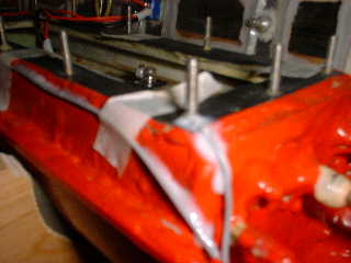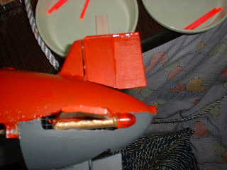 ■方向舵の効きが、悪かったので、舵を大きく(約2倍の面積)しました。 ●バルサ板を使用したのですが、強度が弱そうなので、プラスチック棒で補強しました。 → 舵の効きは、ほとんど変わらない! ウ〜ン 水上走行では、曲がらないな〜 ■追浜での試運転時に、底ずり走行していたので、接触部分を補強しました。