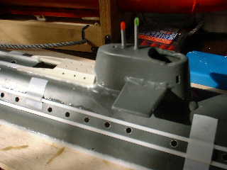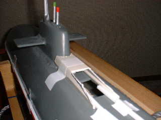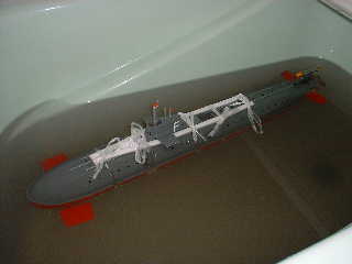 ■垂直(潜航/浮上)を繰り返して、微調整しながら、発砲スチロールを装着しました。 ●走行時の潜航姿勢を重視して、少しだけですが、艦首側に重心を置いています。 → スペース的に、制約があるので、装着は難しいです。 多少の空気が溜まります。