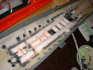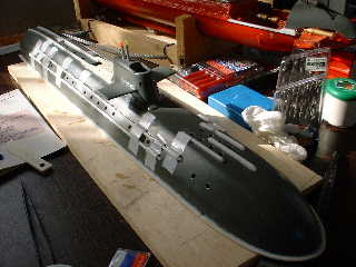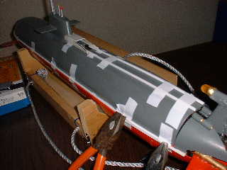 ■全体バランスが大きく変わったので、バランス調整をやり直しました。 ●パラストタンク満杯時に、ゆっくり沈んでいくように、発砲スチロールの装着量と 大まかな配置個所を決めました。