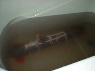 ■底ずり走行対策として、更に、前部と中央部分に、接触部分を補強しました。 ●追浜プールの1.5メートルエリアが、どうしても滑走路に見えてしまうので、 また、意味もなく、車輪(キーホルダーのスケードボードを使用)を4個も付けちゃいました。 → 水底での離陸/着陸時に、効果があるのでは・・・ まっ、いいか! ●2回のテスト走行時に、前部が破壊された。 衝撃度は、予想以上である。 → 更に、補強はしたが、この程度では、ダメであろう・・・ ウ〜ン