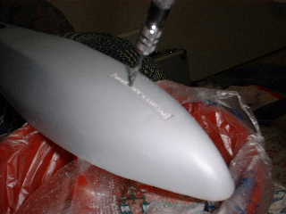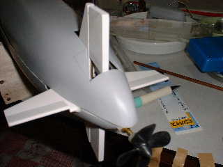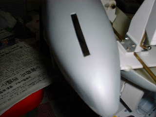 ■垂直尾翼(上側)を装着したが、ハルが高く、動かせない ありゃ! なんでかな? しかたなく、動かせるように、ハルをカッテイングした。 なんか変かも・・・