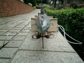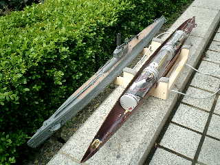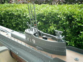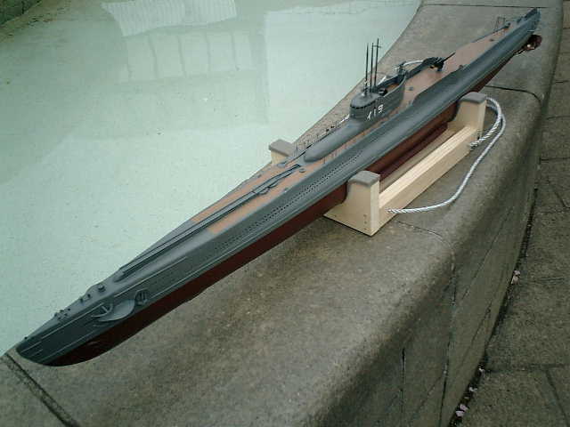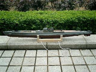 イ−19号とは、当時の日本海軍の潜水艦は、艦隊決戦用という戦術目的を重視し、水上速力と航続力に優れた大型 潜水艦が実在していました。排水量1000t以上を、伊号(イ号)潜水艦であり、甲,乙,丙の3つのタイプが建造され ました。 この中の乙型である伊号第一九潜水艦は、排水量:2198 t(水上)・3654 t(水中)/速力:23 kt(水上) ・8 kt(水中)/主要兵装:14cm砲1門・53cm魚雷発射菅6門、水上偵察機を搭載できるタイプであり、1941年4月28日 三菱神戸造船所で竣工→1943年11月19日ギルバート諸島で、消息不明・・・ 実艦の図面を参考に、スケールモデル(1/77.6)として、可能な限り、忠実に再現されていると思われます。 博物館及び資料館等に展示できる程に、精巧に完成されています。 構想段階での資料文献類の収集から始まり、RC潜水艦としての実現に向けて、設計、材料収集、試行錯誤の実験を 繰り返し、行なわれたと思われます。 細部までのこだわりは、開発者の情熱(思い入れ)により、今、ここに蘇えりました。 外見の再現化と同様に、RC潜水艦として、高性能は実証されているものです。 メカニカル部分も、各機器類及び仕掛けが綺麗に作り込みされており、職人技により実現されたものと感じられます。 → このイ−19号は、高性能RC潜水艦はもちろんですが、美術工芸品レベルの作品です。 室内インテリアとして、家の部屋に飾る事にしました。存在感があり、とても気にいっています。 このRC潜水艦を所有できました事に、感謝しています。 メンテナンス性/耐久力が優れているWTC(ウォーター・タイト・シリンダー)方式は、以前から興味があり、 本体及び各パーツが組み込まれた状態からの改良は、失敗があり試行錯誤なところがありました。 物づくりを楽しむうえで、これらの経験が、今後役に立つと思われます。 水密化としては、船体(ハル)内部に外部からの水が満たされている状態である’ウェット・ハル方式’です。 自分なりに考え、工夫しながら改良をしていますが、1つの事例(やり方)として、ご参考にして下さい。 ■問い合わせ先 ・HONN MODEL CRAFT (ホーンモデルクラフト) ・E-mail : yusio573@feel.ocn.ne.jp