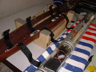 → この調整の手加減は微妙です。 びみょう〜 Cフリーマジック・バンドをステーに通して、船体に固定した状態です。
