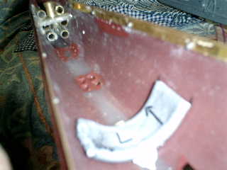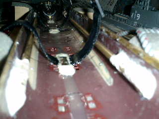 → 欲しい形状のステーが売っていなかったので、こんな素材で適当に作ったのだが・・・ こんなもので、大丈夫かな〜 Bステーをエポキシ(白い部分)で、本格的に接着した状態です。 ・WTC接合部分の中央2個所に、装着できましたが、他は、スペース的に余裕がなく、適当な装着です。 ・この状態では、WTC位置が高くなり、スクリュウが円滑に回転できなくなりましたので、最終的には、右端 1個所を取り除き、左3箇所のみ使用しています。
