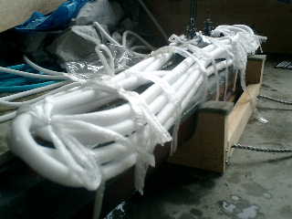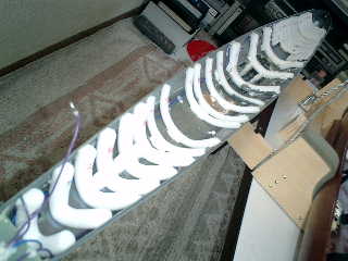 → アンテナ線を並べて、1本立てようとしましたが・・・ この日は、暑かったので、いつのまにか、巻いていました。 蚊取り線香を、連想していたかも! Aハル(上部)内側に、1周り(3メートル)のアンテナ用リード線を設置して、発砲スチロールを装着しました。 ・左側にリード線が1本、跳ねていますが、これは、走行時にWTCからのアンテナ用のリード線をボタン(おや しおキットの残り物)で接合します。