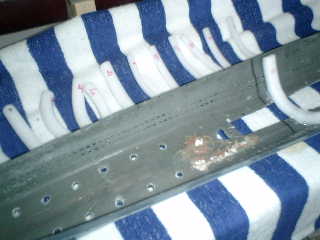 → 綺麗な船体ですので、この穴開けは、かなり悩みました。それに、かなりの穴の数に、なっちゃいました。 う〜ん また、やってしまった! イ−19号も、フランケン化になるのかな〜 トホホ・・・ Aあいからわず、均等な間隔で穴開けできませんでしたので、パッキンを付けてのカモフラージュで、ヤスリで調 整しながら、ごまかしました。