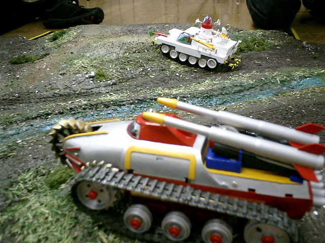 練習走行時に遭遇した、宇宙戦車アトラスは、みずよんさんの作品でした。偶然とはいえ、同場所で この時期に2台が揃うとは・・・感激深いです。(`´)ゞ それにしても、みずよんさんのアトラスは、改良した独特なキャタピラ形状ラインが美しく迫力があ りますので、実在する感じがして、とても羨ましいです。