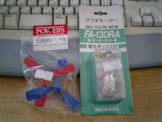子供の頃に、プロペラボートのプラモデルを作った事があり、おそらく、「フェザー(山田模型)?」だったと思 います。ツートンカラー(薄い黄色系と赤色系)のボディーで、後ろ向きにプロペラが装着されており、両側にフ ロートがあり、この中に電池を格納していました。 → プロペラガードが無くて、回転している赤いプロペラに指を当てたら、痛かったです。 (@@; 今では、このようなプラモデルは売っていないようですので、3枚プロペラ(POWER'S製)とFA−130RA( マブチモーター)を使用して、子供の頃を思い出しながら工作する事にしました。