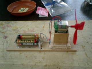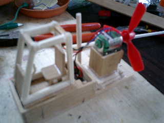 ■プロペラ駆動ユニットです。 土台を木材と割り箸を使用して作って、駆動部品(モーター/電池ボックス/プロペラ)を固定しました。