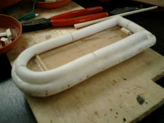 ■船体です。 船底部分は、木材板を使用して、輪郭部分に発泡スチロールを囲んで固定しました。