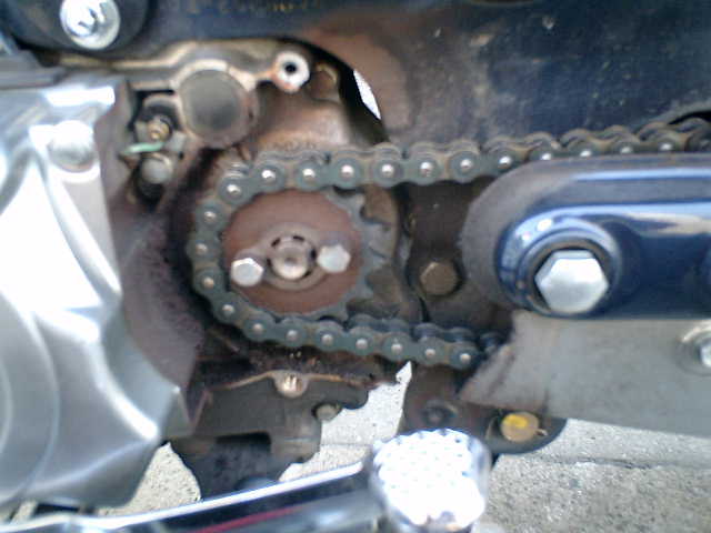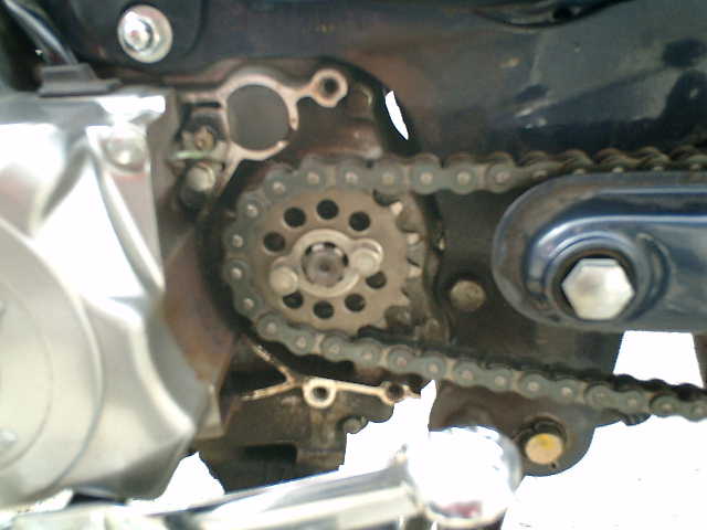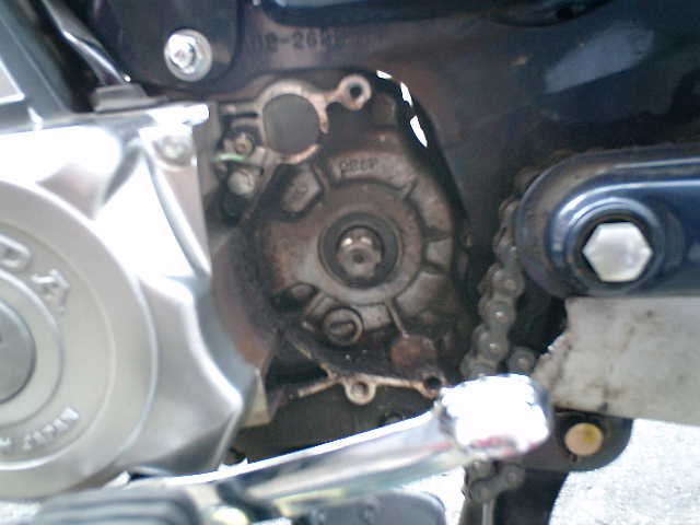 ●クランクケースを取り外しましたら、ドライブ・スプロケ(15T)が見えました。