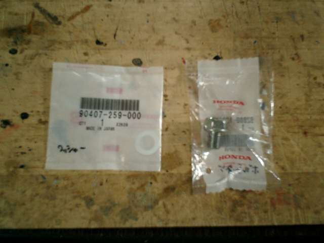 ●エンジンオイルを抜く時のネジ穴に入れるドレンポルトも交換します。 ドレンポルト山が潰れてきて、'なめる'感じですので、交換することにしました。家の近く に、スーパーカブ・ミニバイクの専門店ができましたので、ドレンボルトとドレンワッシャ ーを購入しに行きました。