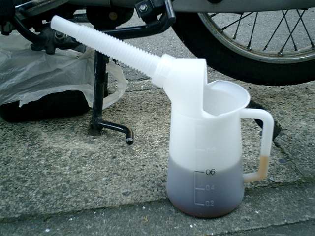 廃油が出なくなったので、車体を右側(マフラー側)に傾けたら、更に出てきました。
