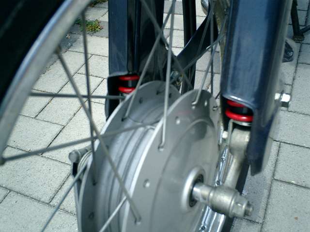 ●足回りが柔らかいので・・・ ノーマルはバネ式のショックでしたが、ちょっと硬めで、2層式ダンパー部分は減衰の動き を重視したスーパーカブ用スポーツショックに交換しました。