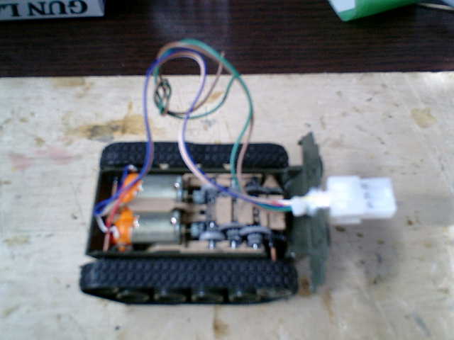 ■駆動部分の車体(下部)が完成しました。 キットでは左後進のリモコン操作を行なえば、左(前進・後進)用の駆動車輪は回転せず、BB弾が発射するように なっていました。これは、左(前進・後進)用の駆動車輪を2重反転の類似構造で、正転方向では回転させて、逆転 方向では空転させる仕組みです。リモコン戦車としての駆動操作性を重視し、空転させないように駆動車輪を固定し ましたので、これにより、BB弾用の仕掛けが稼働しなくなちゃいました。 (^^;