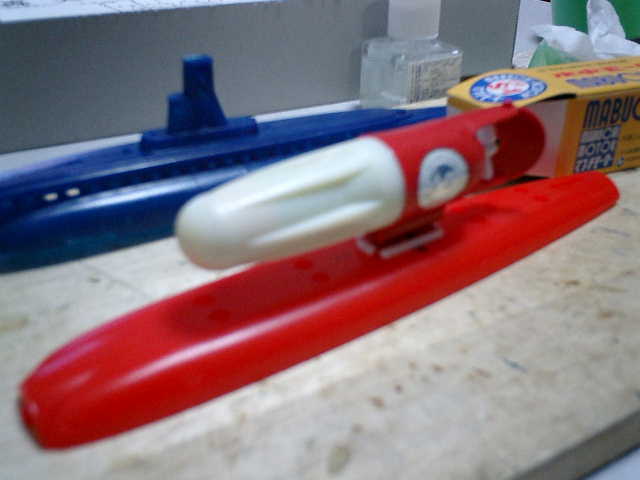 子供の頃に、ゴム動力で走行するプラモデルの海底軍艦(轟天号)を作って、銭湯で遊ん だ事があります。渦巻き形状のスクリュウが艦内後部に装着されていて、ゴムを巻くのは ドリル先端の針金状の物をグルグル回転させていました。オモリは、ヨットみたいに縦長 に装着していて、スプーンみたいな物で、変な形状だな〜、と感じていました。子供の頃 の製作ですので、当然ながら、まともな走行ができなかった事を記憶しています。(^^; → さーて、大人になってのリベンジです・・・ がんばるぞ〜 (^^)/