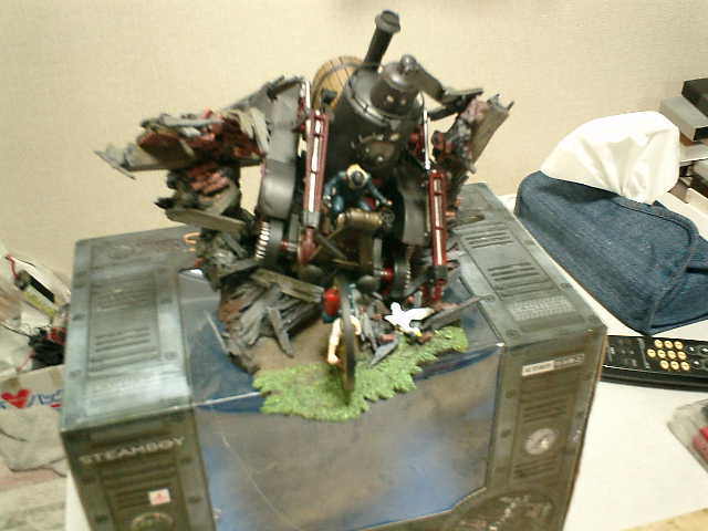 家の近くの模型ショップで、処分品(売れ残り物)が入っているワゴンを見ていましたら、 リアルに仕上げられた飾り物がありましたので、なんとなく、買っちゃいました。(^^; それは、スチームボーイの’ムービーリエリゼーションジオラマ’で、映画「スチームボー イ」(2004年)の冒頭シーンで、主人公の少年が、歯車メカに追われるシーンを躍動感あふ れる立体静景をフィギュア化したものです。