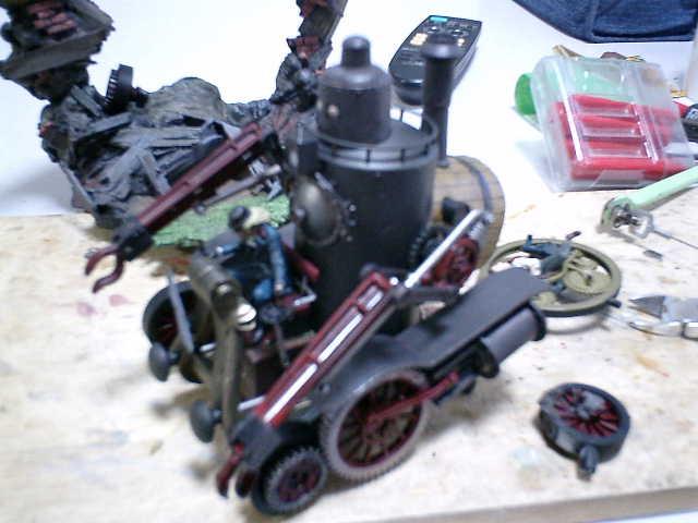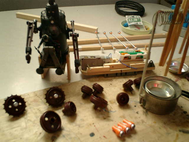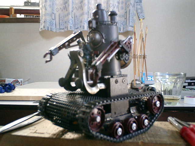 これまた、変な物が、できちゃいましたが・・・ 実在及び空想の世界でも存在していませんが、車名としては、蒸気機関式ロボット車ですね ■自分勝手に背景設定しましたら・・・ 人力から機械へと、大きく変貌する産業革命時代の活気ある時期に、工場などの建築物が急 激に建てられる状況の中、現在のような電子的なロボットではなく、人間の操作力に頼る部 分がある、蒸気エネルギーを活用した機械式の半ロボットが生産され使用されていました。 主に、建築物の建て直しに伴う、小屋などの旧建築物の解体作業で活躍していました。