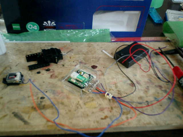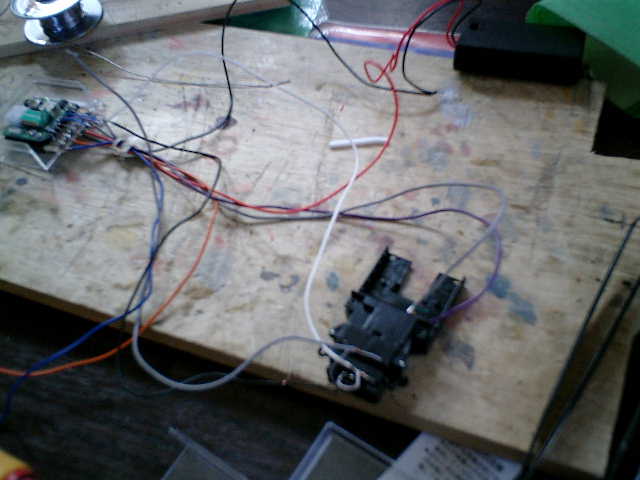 ●動力モーター(マブチ製:SH-030SAかな?)の動作確認 ラジコン基盤を取り出して考察していましたら、いつの間にかリード線が切れちゃいました。(^^; リード線が細いので、プラスチック台に固定させて、太目のリード線を新たに結線しましたです。