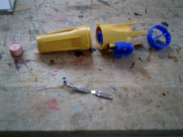 ●水中モータ部分のパーツです。 水中モータの使用後は、微量の浸水がありますので、この溜まった水を抜いて乾かす為に 最先端部分に、弁当などに付いているソース又は醤油を入れている小さな容器のキャップ 部分を装着する事にしました。