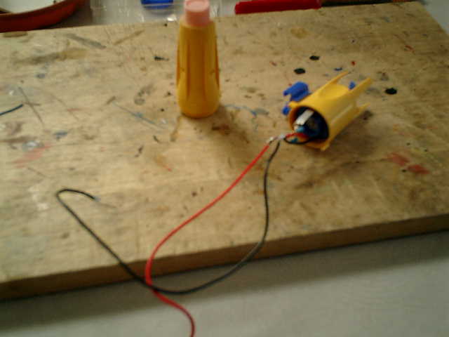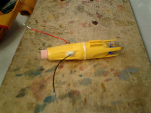 ●水中モータの作り直しです。 水中モータの付属モータ( タミヤ製:FA-130タイプ )を使用していましたが、適正電圧が 1.5Vですので、悲鳴を挙げながらのモータ回転で、このまま使用していれば、何れ動か なくなる感じです。本来使用すべきRC機器と相性が良い、インドアレーサーに搭載してい た動力モータ(マブチ製:SH-030SAかな?)を使用しての作り直しを行う事にしました。