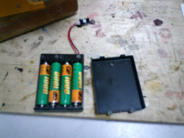 ●使用する電池です。 インドアレーサーは、車体内部に小型の充電池(ニッケル水素120mAh:3本)が装着 されていましたが・・・ 単4の充電池(4本)を使用して試す事にしました。(^^;