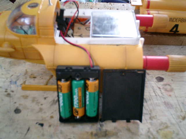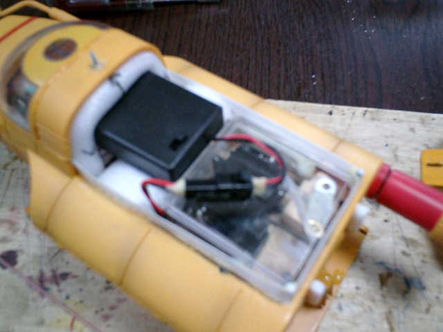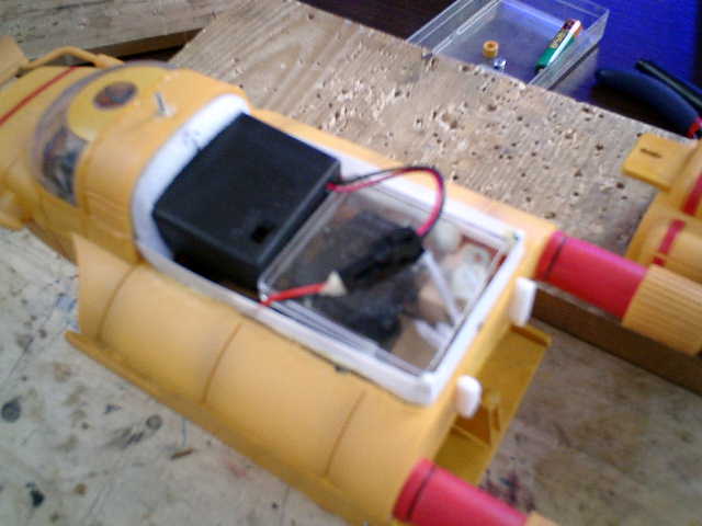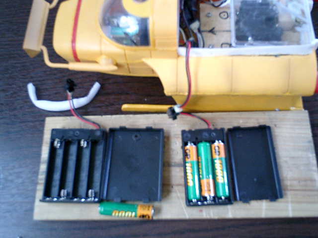 ●テスト走行後のプチ改良です。 単3の充電池(3本)では、持続時間数的に良いのですが、浸水してくる位置を喫水線より 少しでも高くした方が良い感じですので、単4の充電池(3本)を使用して、少しでも重量 を軽くする事にしました。また、船体の重量バランスを安定させたいので、電池ボックスが 走行中に動かない様に、発砲スチロールを使用して簡単に枠組みしました。