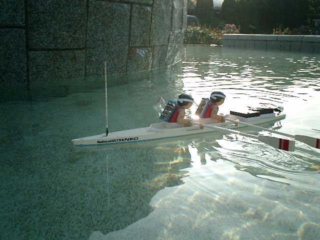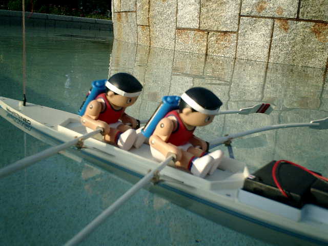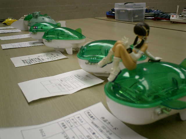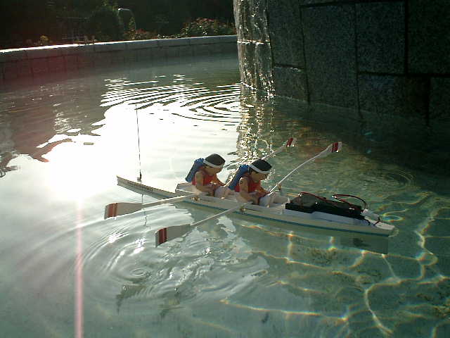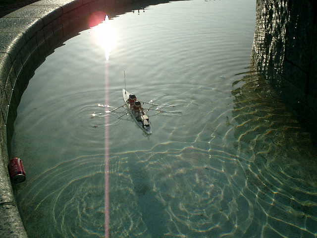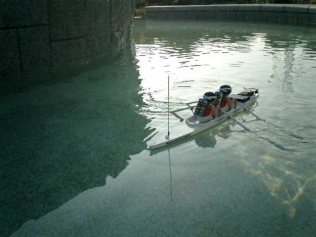 ●走行後の感想 ・ノーマルの3Vモータに交換しましたので、パワー半減のノロノロ走行しかできない のですが、モーターコントロールIC(MP4212)からの発熱があります。(^^; ・この発熱が要因かもしれませんが、始動後、しばらくすると、オールの動作が停止し ちゃいます。全開操作時は、モーターコントロールICへの制御信号は、フル回転さ せている状態に設定していますので、これが要因かもしれません (^^? 電力消費が悪いと思って、スピコン回路の電力供給源を2系統化しましたが・・・ ・ノイズ対策として、受信機のアンテナ位置は考慮しましたが、信号線とグランド線が 長い配線しており、オールを動かす駆動ユニットからの機械的?なノイズは仕方がな い感じですので、サーボがガチャつく事象は完全に打ち消す事はできませんでした。 ・オールのジョイント部が強度的に弱く、耐久性は無い感じですので、この手漕ぎボー トは、一発物ですね・・・しかしながら、ある程度の直進性、旋回性がありました。