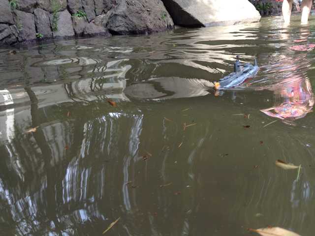 ●自動浮沈は、とても難しいので・・・ このプラモデル潜水艦は、自動浮沈しながら走行するのですが、私の工作技術では、まと もに動かせない感じでしたので、水中モータを装着して水上走行するようにします。