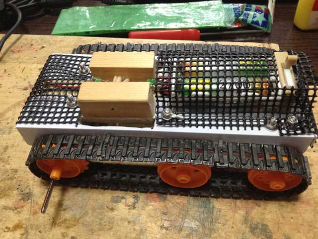 ●歯車メカと合体できるように車体を長くしました。 車体外見は、お手軽にネット(植木鉢用)を装着しています。