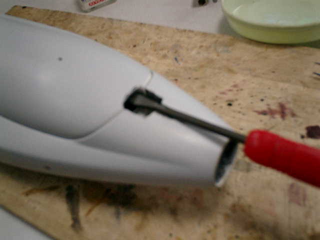 ●さーて、試しに・・・ アッパーボディーを、外してみます。 ボディー(上部・下部)フックの間に、マイナスドライバーの先を入れました。