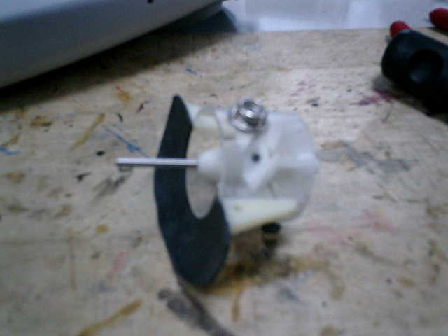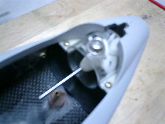 ●ポンプユニットの取り外しです。 船体にネジ留めで固定されていますので、ネジを回して取り外してから、ポンプユニットを引き抜くような感じで 取り出しました。アクリルパイプ内の最後部に、シュラウド(白色の風車?みたいな物)が装備されています。
