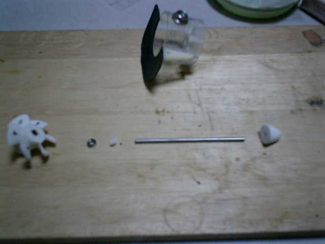 ●ポンプユニットを、組み立てました。 取り出したポンプユニットのシュラウドの軸穴に、スクリュウ・シャフトを通して、各パーツを差し込んで組み立てました。