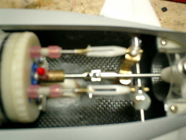 【上部】舵のリンケージ部分です。 【中央】スクリュウ・シャフトの連結部分です。 【下部】昇降舵のリンケージ部分です。