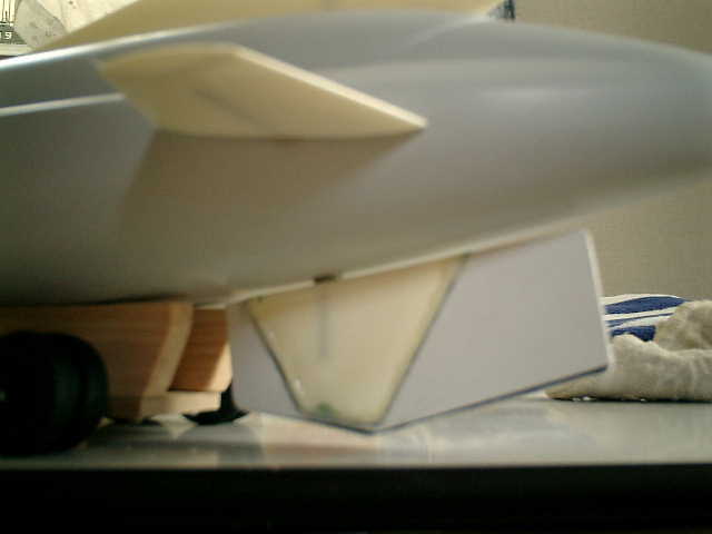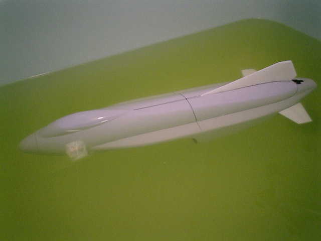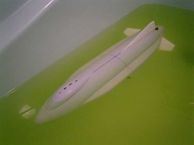 ●バランス(浮力/重量)設定です。 アクアレ−サ−として、走行スピードを重視した場合は、既存の軽量はベストなのですが、あえて自分好みのセッテイング を行いたいので、ウエイトを重たくする事にしました。(^^; 家のお風呂で、暫定的に浮力材(発砲スチロール)を付けて、オモリの最大重量を求めた結果、145グラムでした。 これに伴い、浮力を増やす必要性がありますので、浮力材(発砲スチロール)を追加装備します。