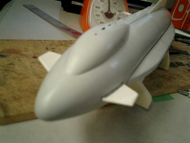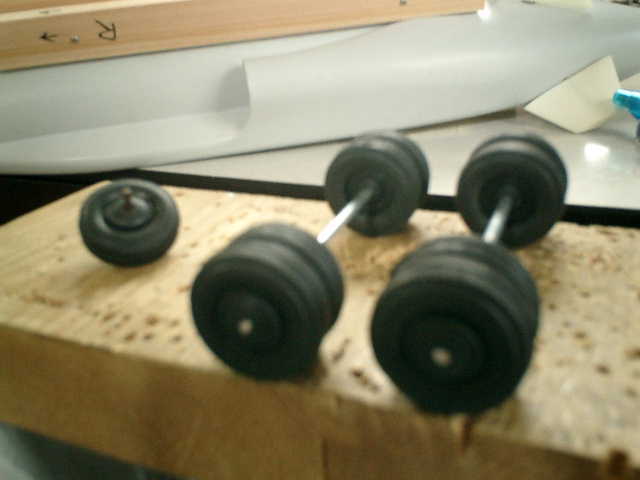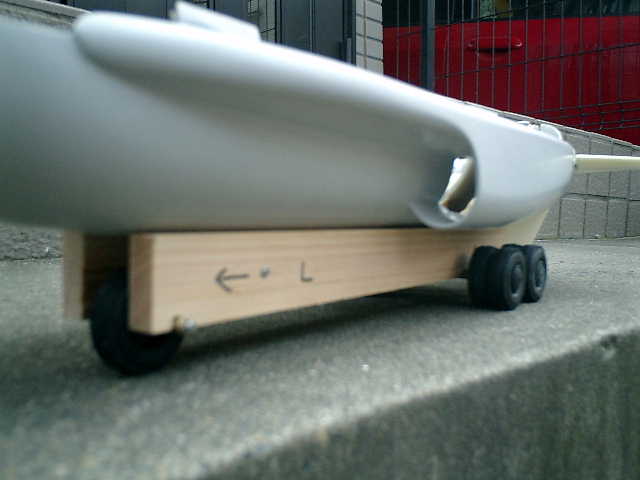 ●ジェット機のような、船体形状をしていますので・・・ 車輪を装備したら、似合いそうな感じですので、試しに、装着する事にしました。 かなり、おもちゃ色の濃い、安価なタイヤを使用します。(^^;