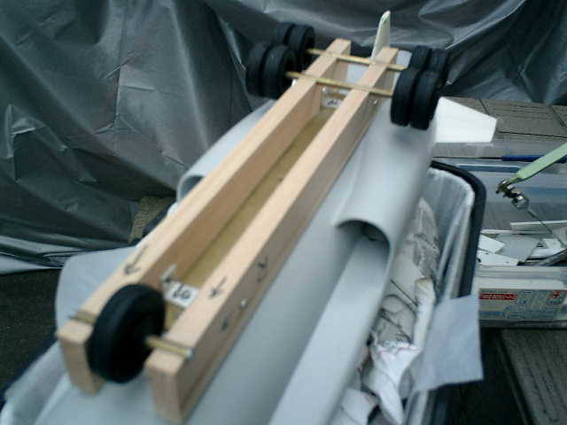 ●車輪軸を固定するフレームです。 ジェット機のようにしたいのですが、とても無理ですので、お手軽に、木材の半端物を使用して作ります。