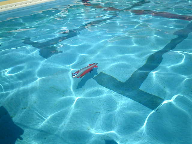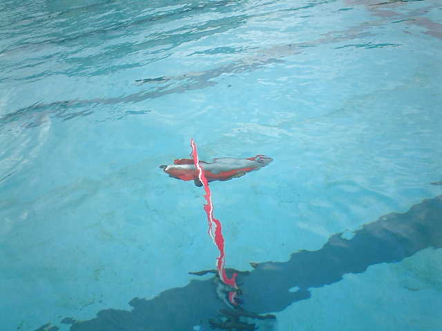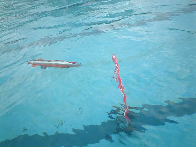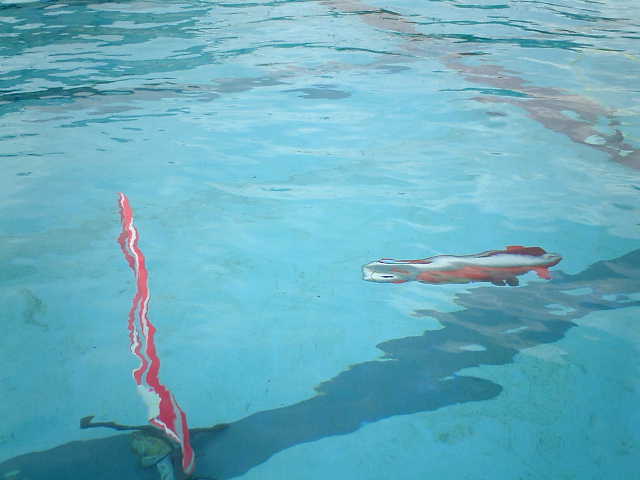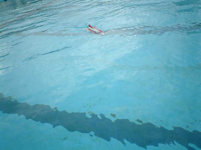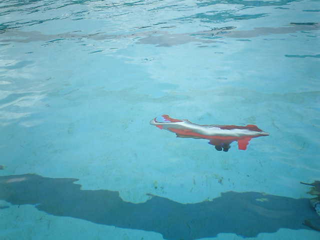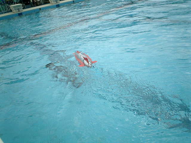●これまた、前方(右方向)の水底に、赤色リング(フラフープ)が観えます。
