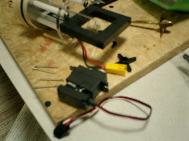 ●サーボ取付け台の枠に入れました。 ラダー用サーボ(左側)を入れてから、潜舵用サーボ(右側)を入れました。