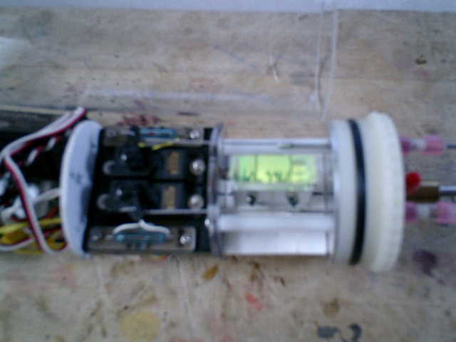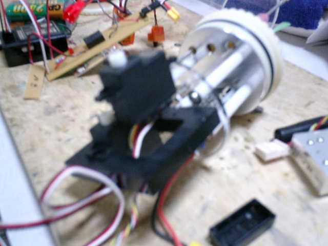 ●サーボ取付け台の両側に、マグネットスイッチのリードスイッチを設置しました。 イ−19号のWTC内に搭載しているものと同じ、マグネットスイッチ(MOF−2)を使 用しました。WTC内に、円盤形状のセパレート壁を入れたいので、塩ビ板で作りました。