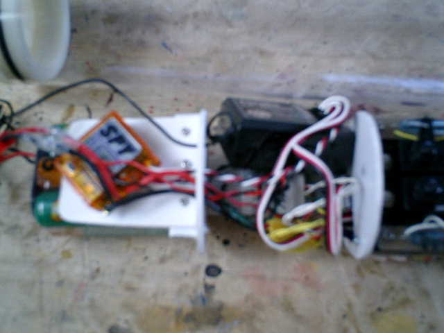 ●前部エリアの機器類設置です。 ・【左側】最先端部のエリア (下部:バッテリー、上部:スピードコントローラ) ・【右側】先端から2つ目エリア (受信機・マグネットスイッチボックス) セパレート壁(円盤形状)は、底部分全体に細いアルミ板を装着しての固定です。