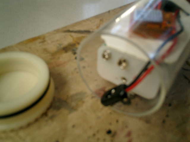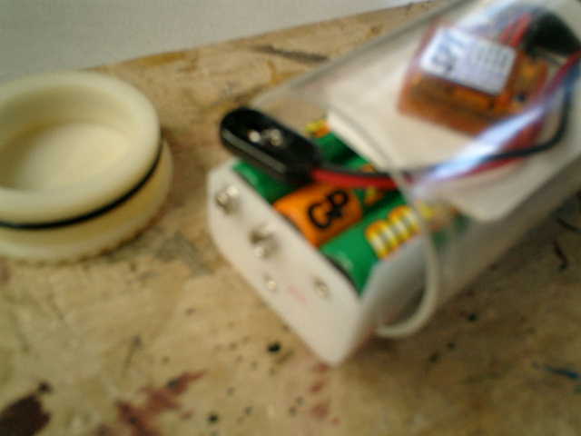●電池ボックスの先端が観えました。 当初は、キット付属のバッテリー・バック(単3:6本)を使用していましたが、動く模型 が好きですので、模型らしく、より汎用性を向上させて、電池ボックスを使用しての電池単 体(単3)を交換する方法にしました。