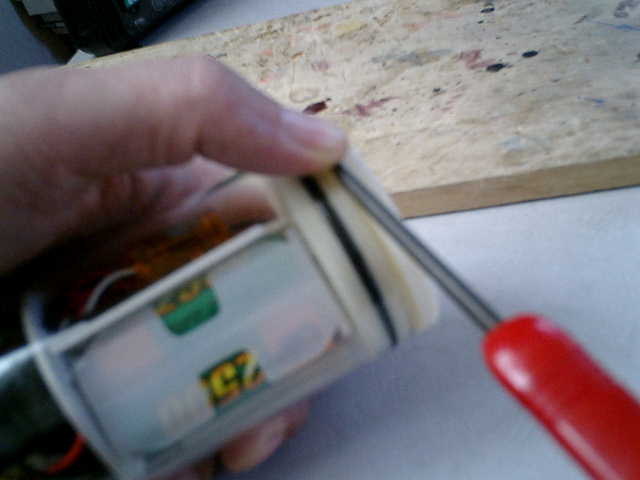 ●本体キャップとアクリルパイプのすき間に、マイナスドライバーの先端を沿えます。