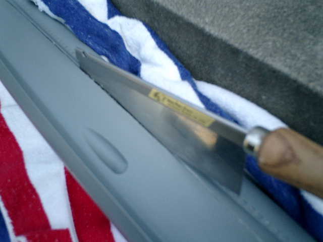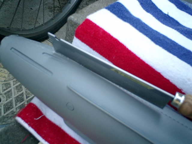 ●さーて、ハル(船体)の切断開始です。 精度が求められる このような作業は、とても苦手で真っ直ぐに切れなくて、過去に多々の 失敗を経験していますので、最初は軽く切れ目を付ける程度でノコギリの傾斜角度を小さく して、恐る恐るゆっくりと時間をかけてハル(船体)の左右に切れ目を入れました。(^^;