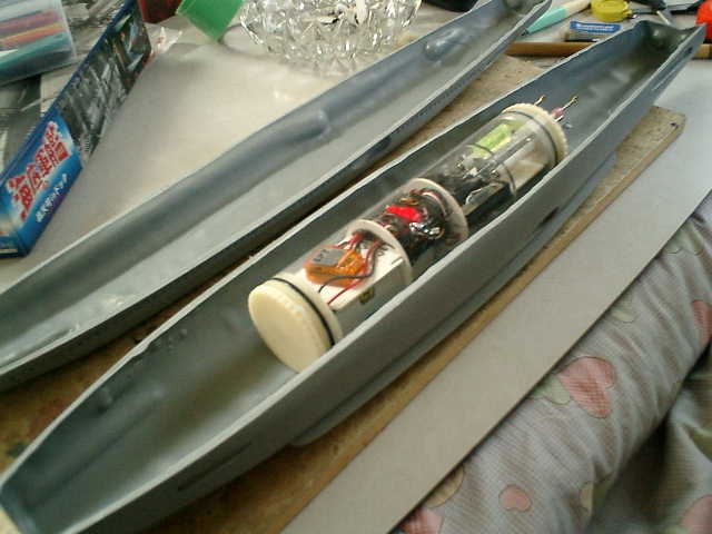 この組み立てキットは、井上雅夫氏の原型製作によりディスプレイ用として製品化されたも のですので、組み立てを行い、家の棚に大切に飾ろうと思っていましたが・・・ 水中で動かす事ができれば、楽しそうですので、いつもの事になりますが、無謀にもラジコ ン化への建造に着手する事にしました。材質的にはソフトビニールですので、強度が弱くて 温度変化により変形しやすくラジコン潜水艦としては、製作作業も含めて難しく感じます。 このような改造形態は未経験ですが、多少の興味がありますので試してみたい気持ちもあり 耐久面は無視して製作する事にしました。 → ソフトビニールは、柔らかいので・・・ ちょっと、不安です。(^^;