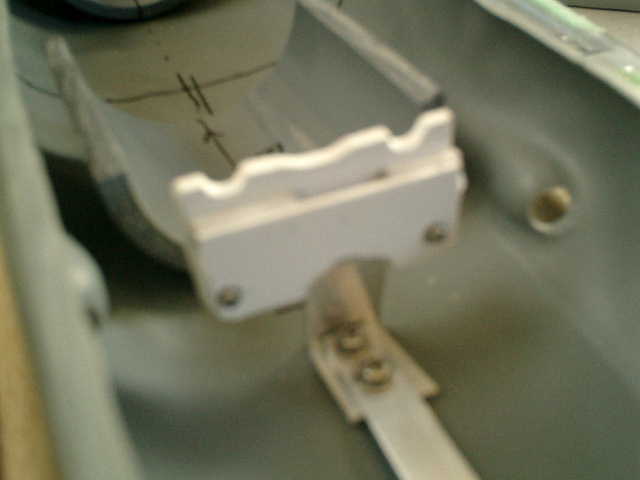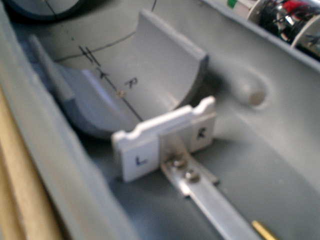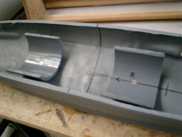 ●汎用WTCを、はめ込む台を装着する。 汎用WTCを、はめ込む方式で固定する事にしますので、船底の上に、汎用WTCの外径に 合わせた配管パイプを半分に切った物を装着しました。サイズに合う配管パイプがありませ んでしたので、仕方なく、配管パイプの部品(継ぎ手)を、2分割使用しています。(^^;