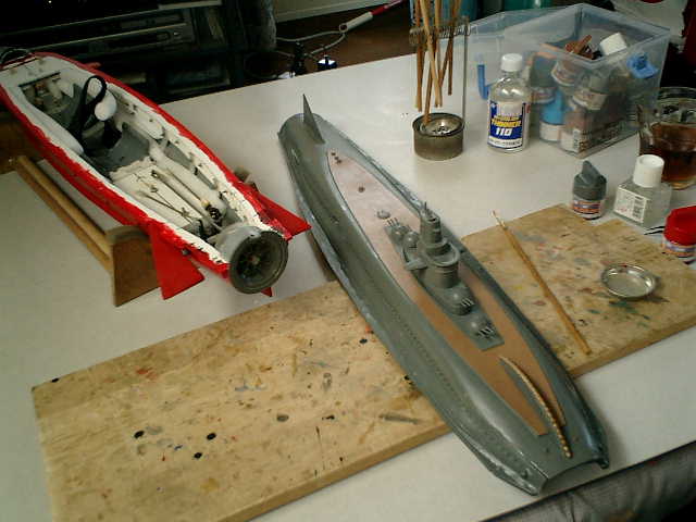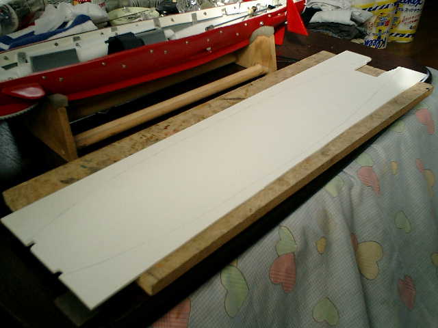 ●さーて、船体変形の対応ですが・・・ 船体の変形度が、かなり進んでおり、簡単な微調整レベルでは船体を合わせる事は、とても 難しい感じですので、試しに、船体(上下部)の間に板(低発泡塩ビ板)を挟んで、変形度 合いを確認しながら様子を見ての対応で試行する事にしました。(^^;