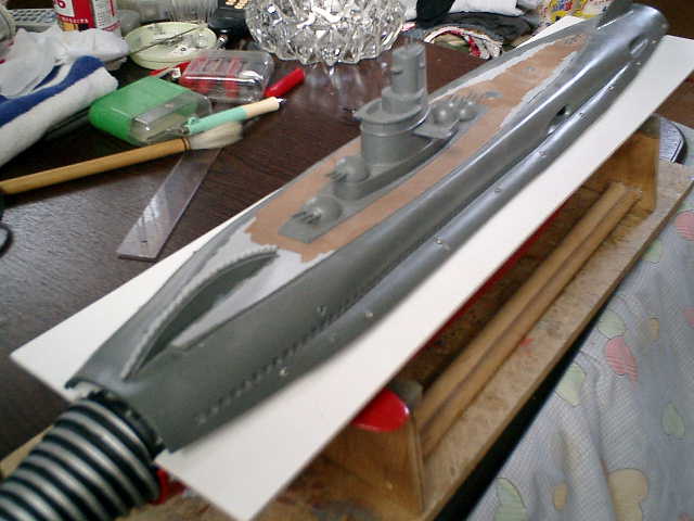 しばらく何もせずに、船体を放置していたので、そろそろ建造再開と思い、船体の上下を合 わせましたら、船体(上部)が、大きく変形しており、まったく合わない状況になりました です。(^^;